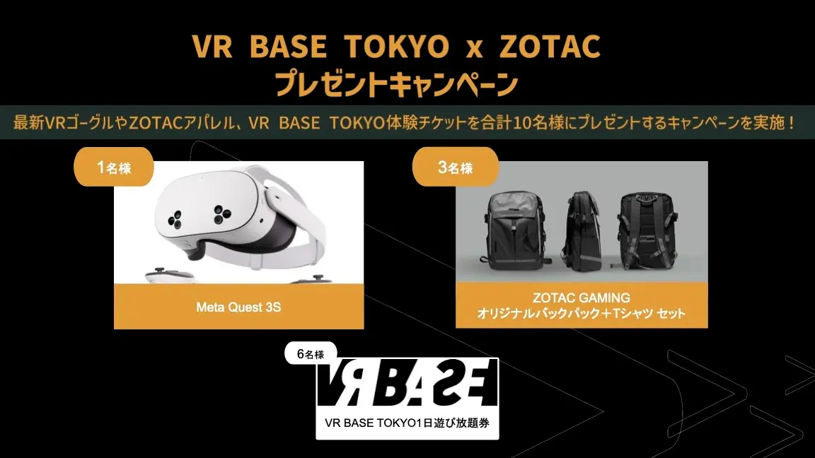最新VR・MRヘッドセット『Meta Quest 3S(128G)』や「ZOTAC GAMING」ブランドの容量23LのオリジナルバックパックやTシャツ、VR BASE TOKYOご招待券などの賞品を抽選でプレゼントします。
