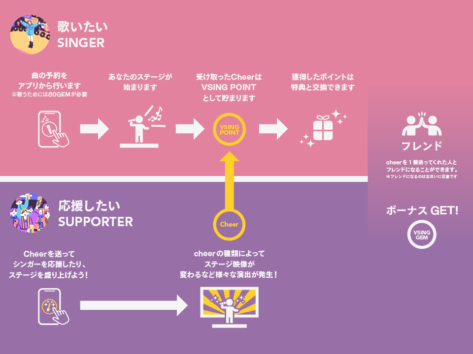 お客様は「シンガー(歌い手)」または「サポーター(聴き手)」としてVSINGに参加します。