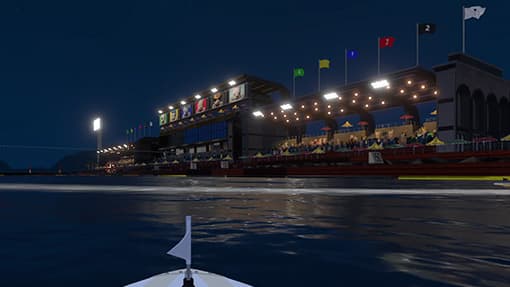 風・水しぶき・振動ギミック付きボート型筐体に搭乗し、レーサー目線で臨場感抜群の本格ボートレースをVRで楽しめます!